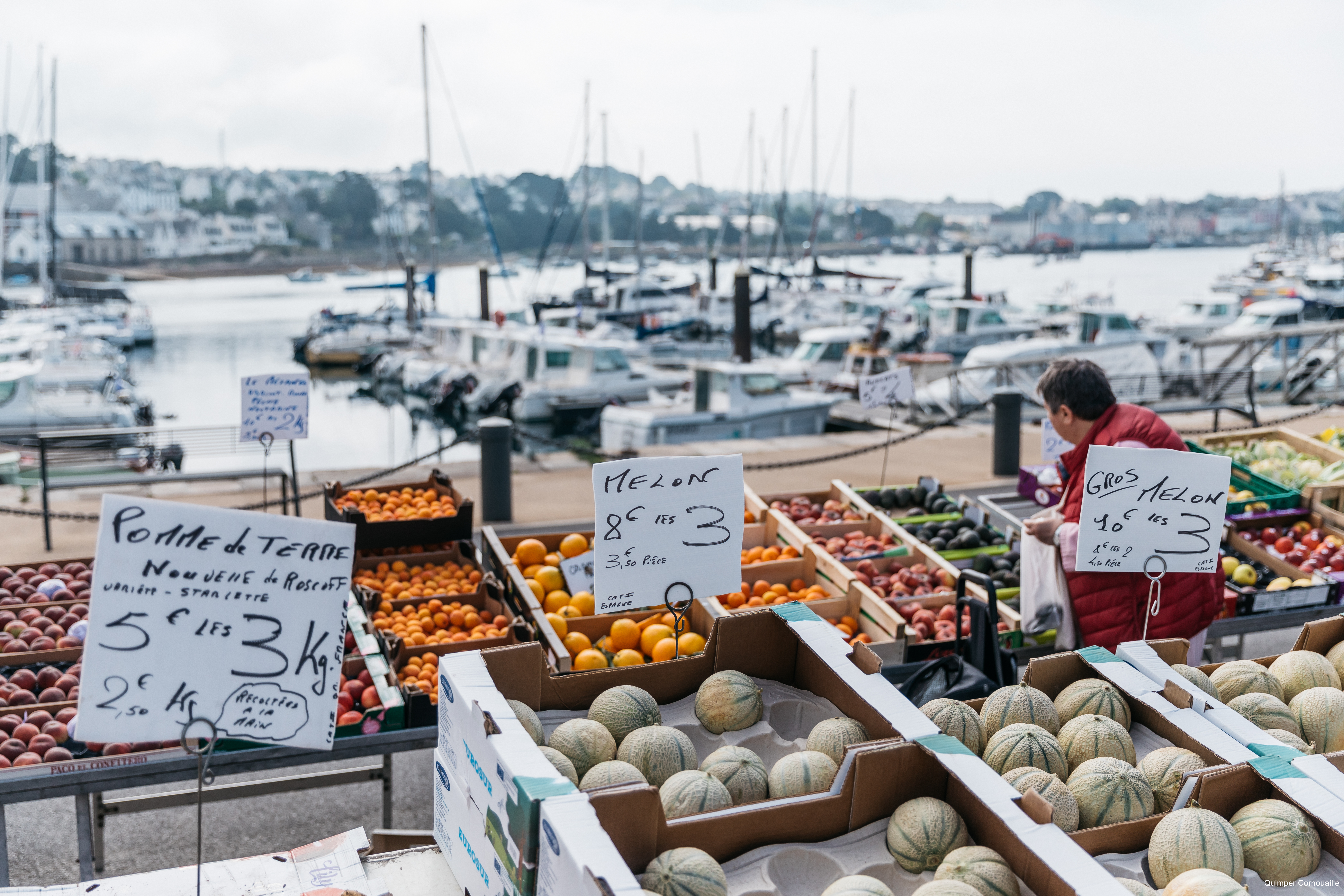 Fruits sur étalage au marché d’Audierne, vue sur le port à l’arrière-plan