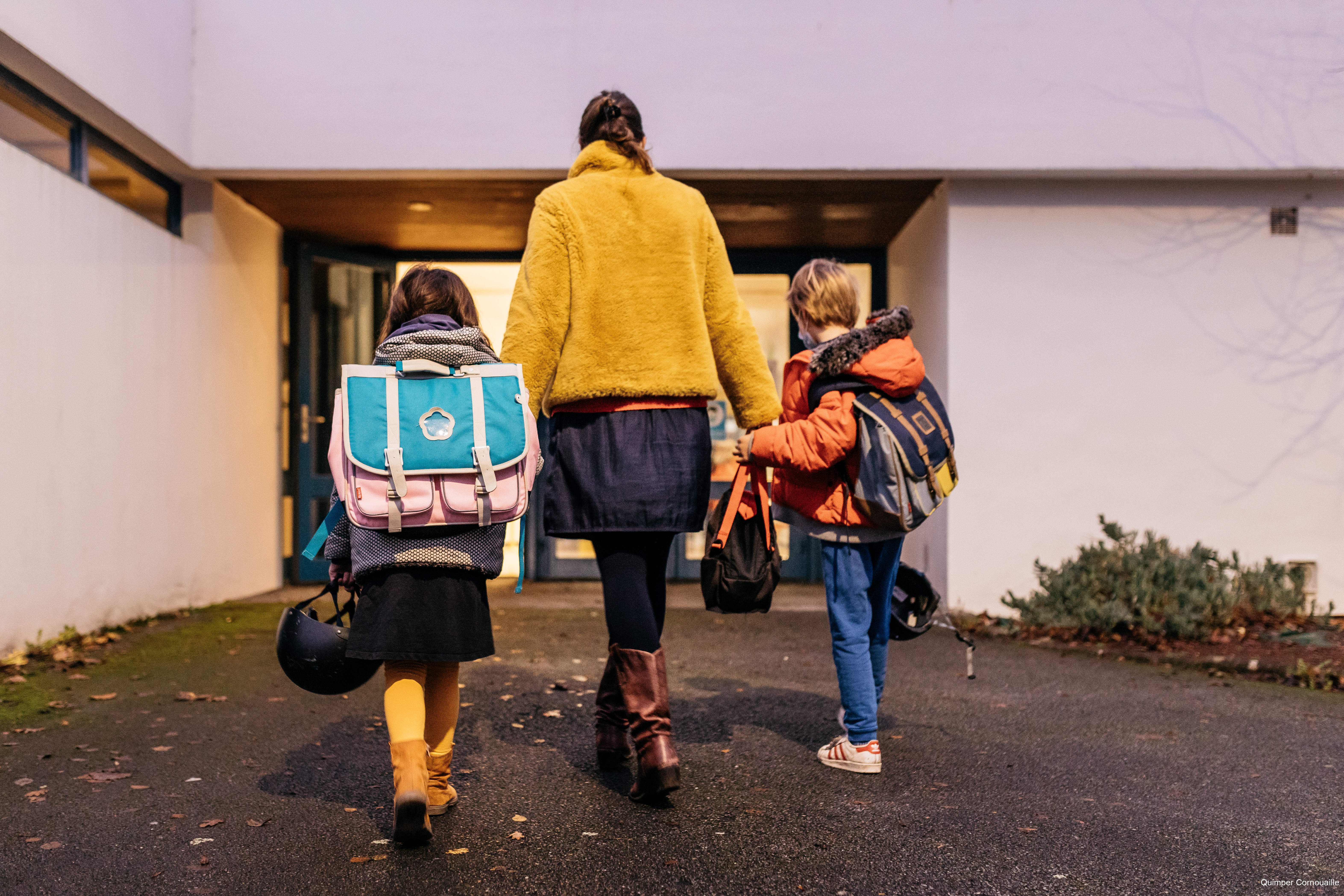Femme emmenant enfants avec cartable à l’école