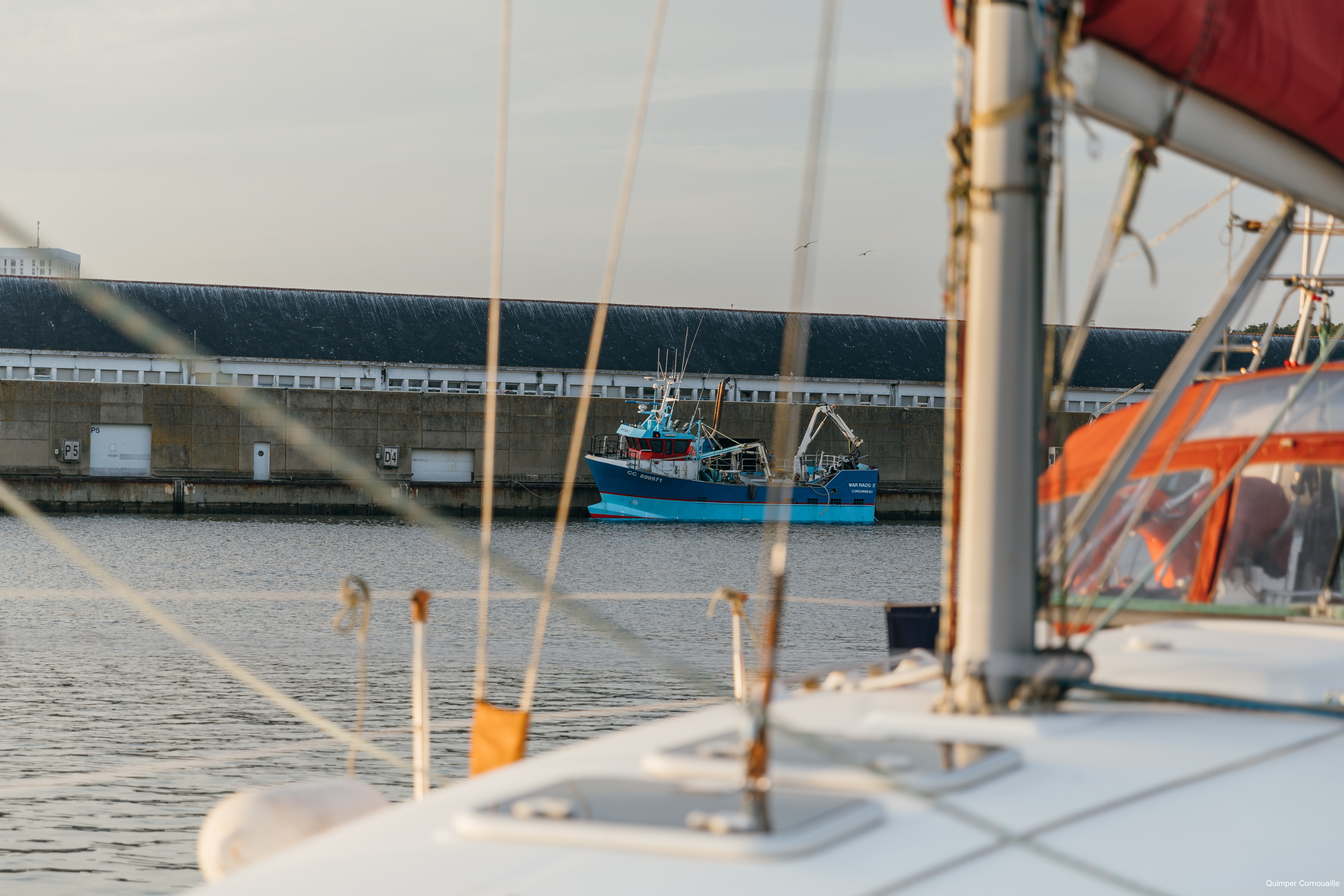 Voilier jaune, chalutier rouge, quai du port de Concarneau