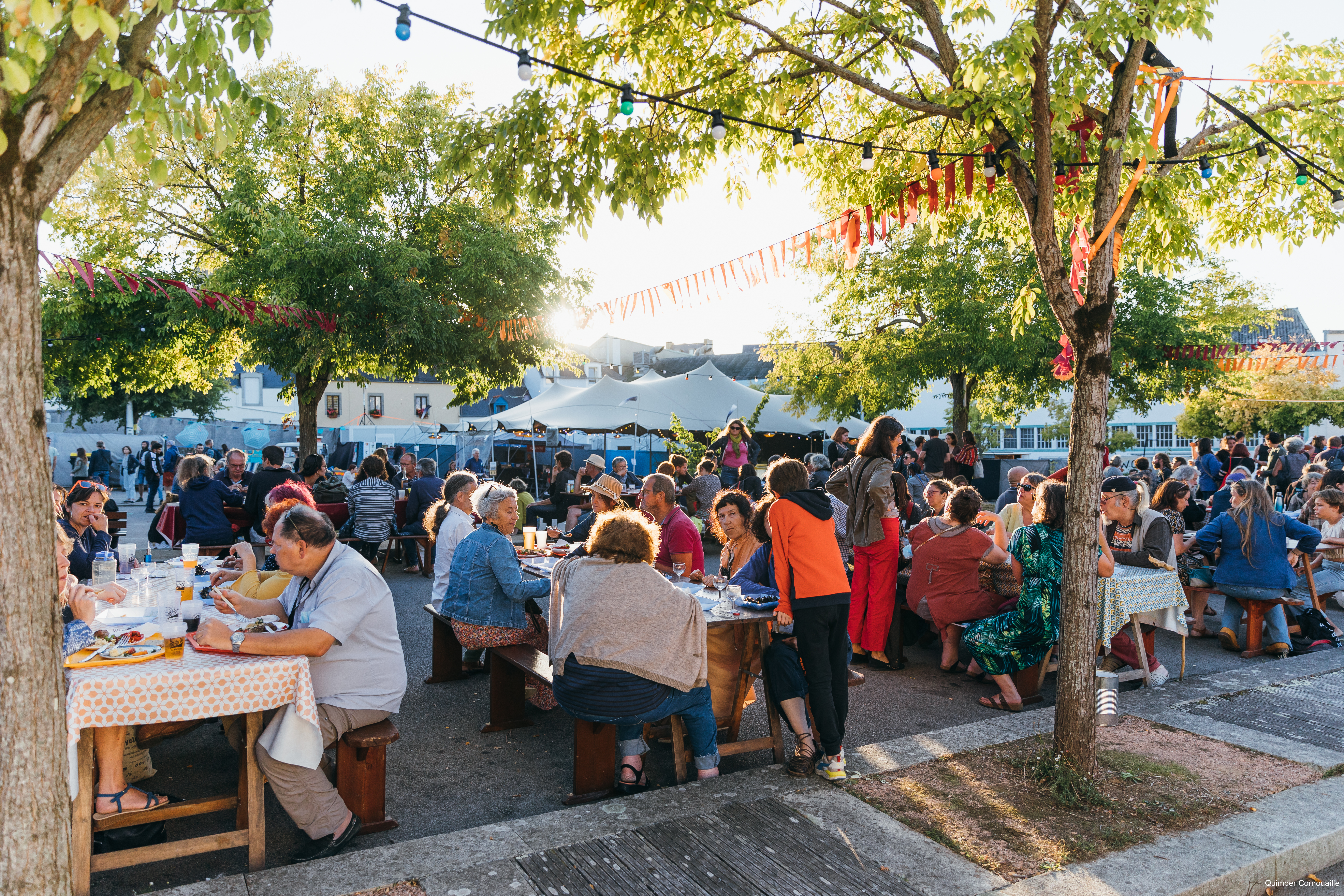 Festivaliers déjeunant à l’extérieur lors du Festival de cinéma de Douarnenez