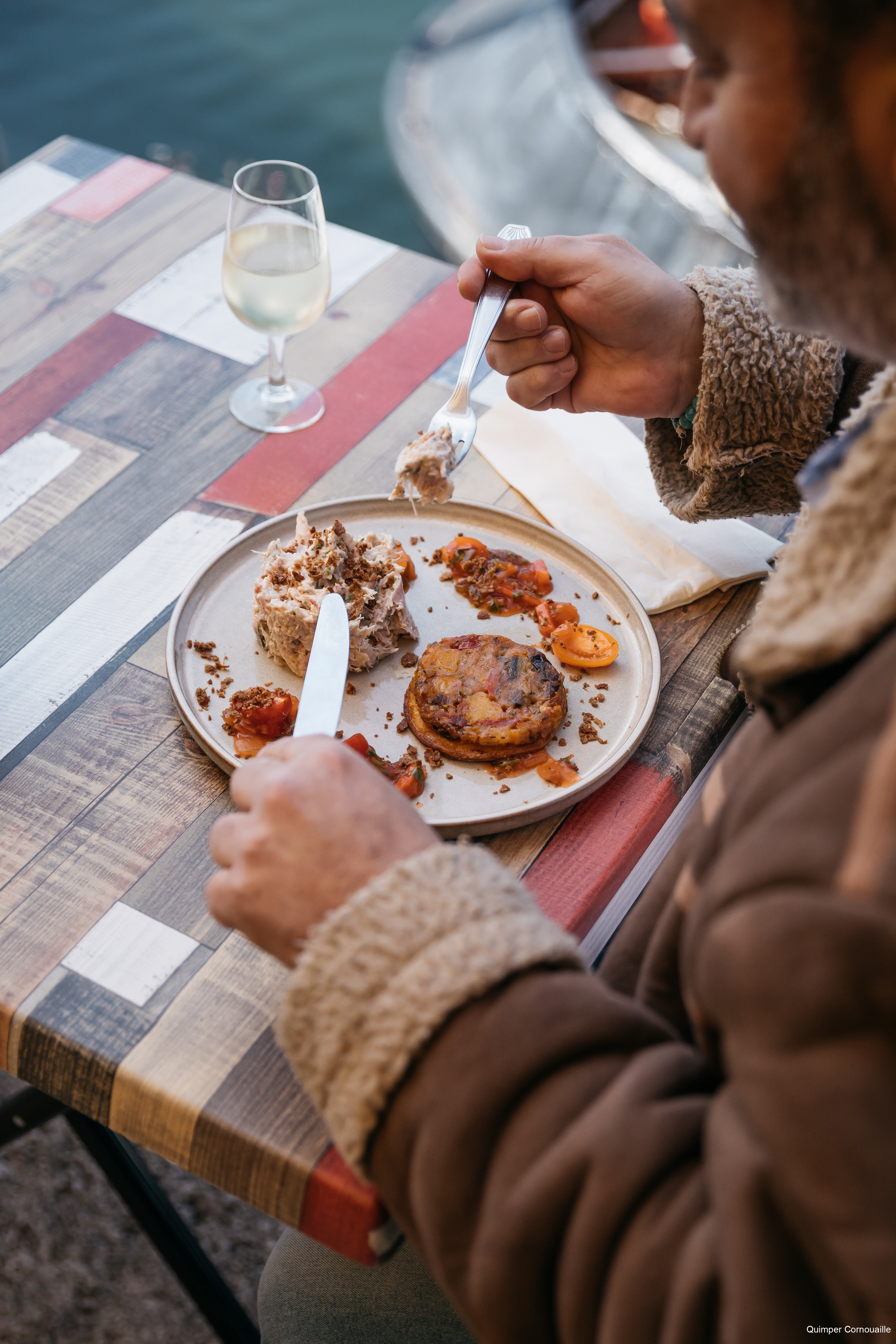 Personne mangeant des rillettes de poisson sur les quais du port rhu à Douarnenez