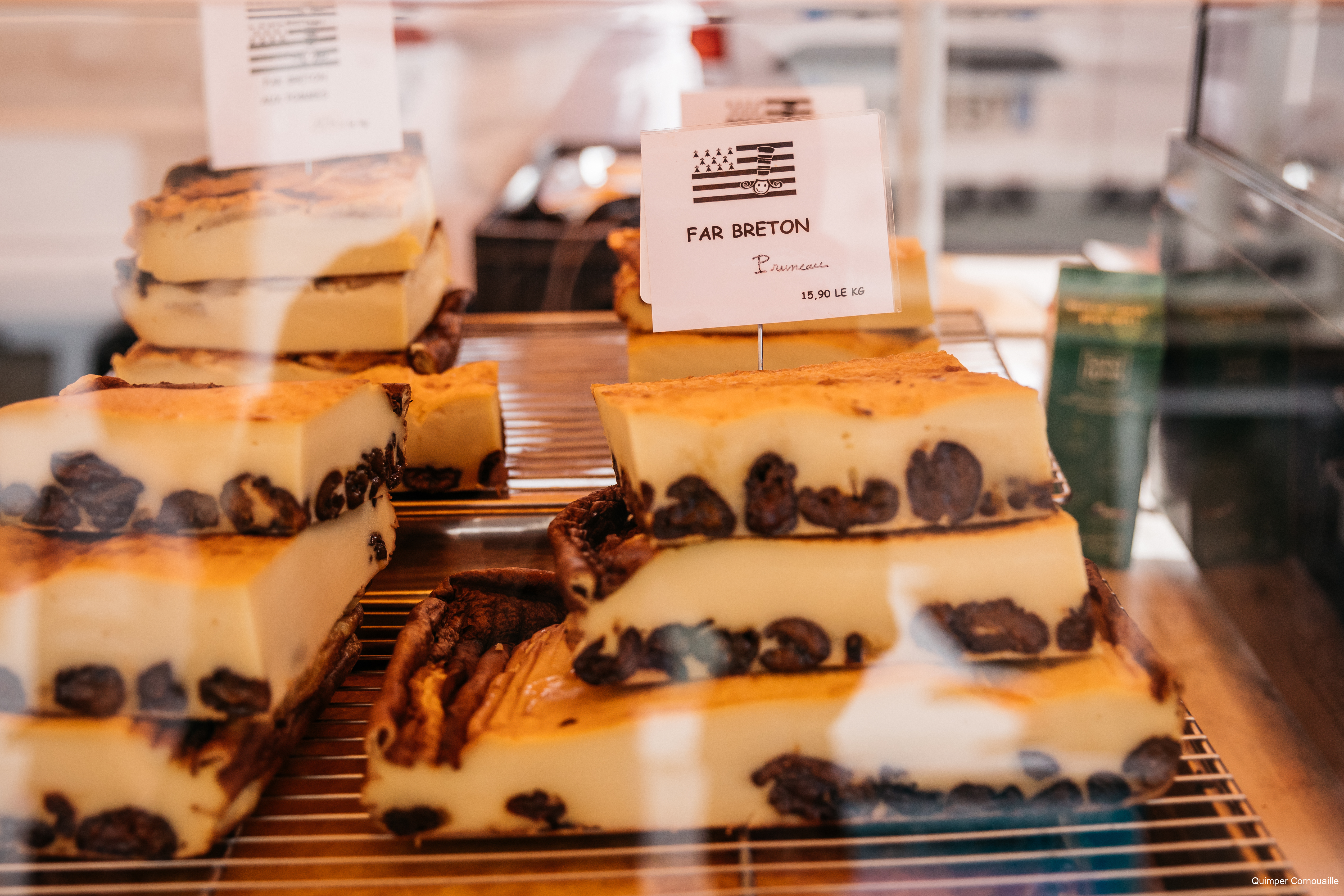 Far breton dans une vitrine sur le marché d’Audierne