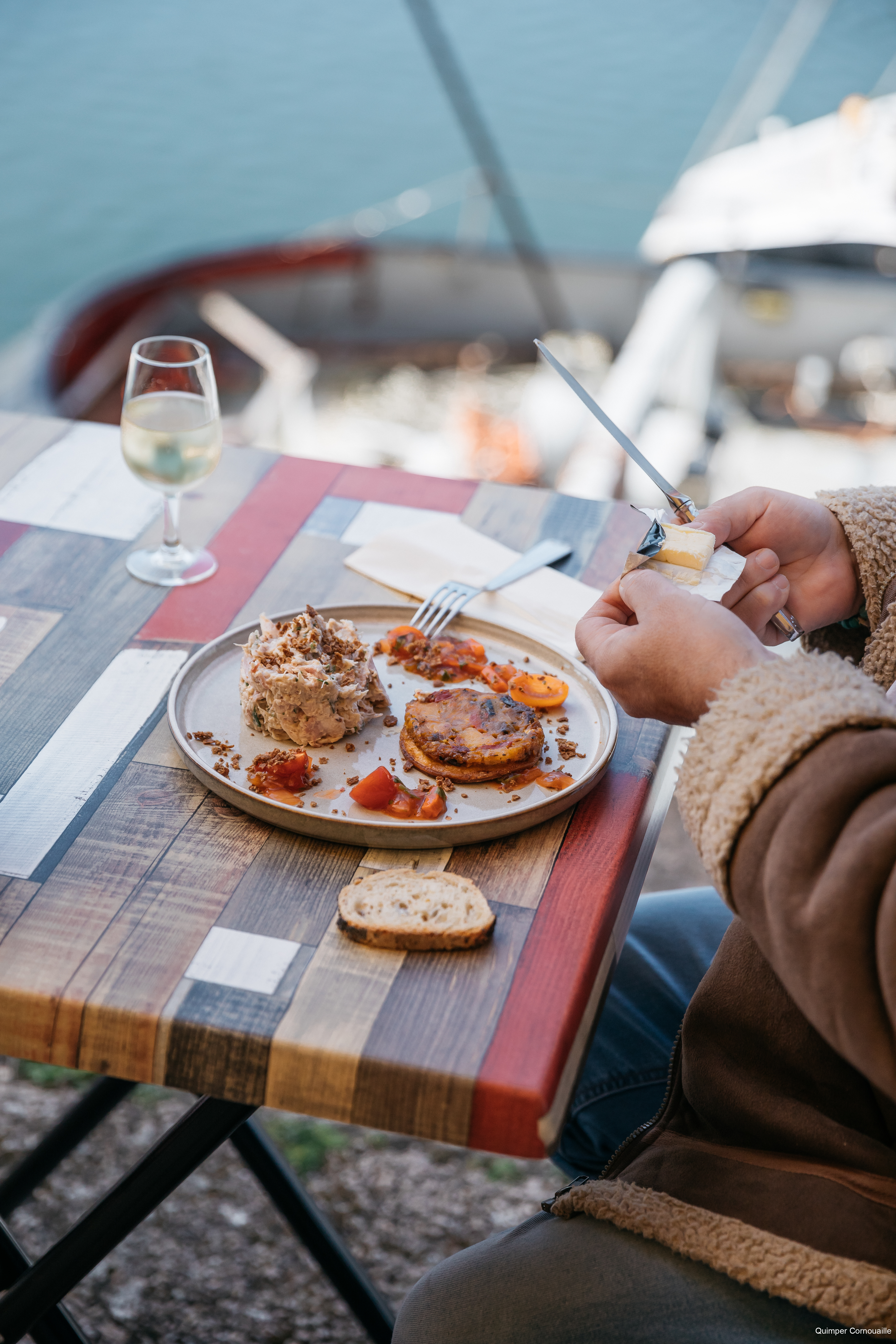 Personne en train de manger à la terrasse d’un restaurant sur le port de Douarnenez, vue sur un bateau à l’arrière plan