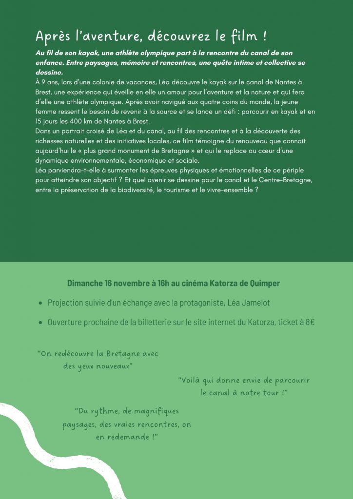 Léa Jamelot, talent de Quimper Cornouaille, présentera son aventure “Léa de Nantes à Brest en kayak” sur les écrans de Quimper le dimanche 16 novembre à 16h. La projection sera suivie d’un échange avec Léa Jamelot.